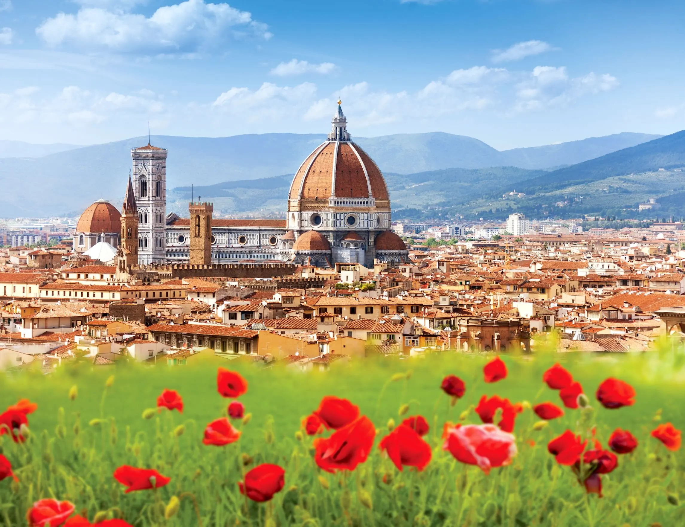 Le départ pour Florence aura lieu en train. Vous découvrirez avec votre guide quelques-uns des plus beaux monuments de la ville lors de la visite panoramique: l’église Santa Maria del Fiore avec la prestigieuse coupole de Brunelleschi et son imposante façade, le « Campanile de Giotto » ainsi que le Baptistère avec ses portes de bronze (dont la plus célèbre est la Porte du Paradis).